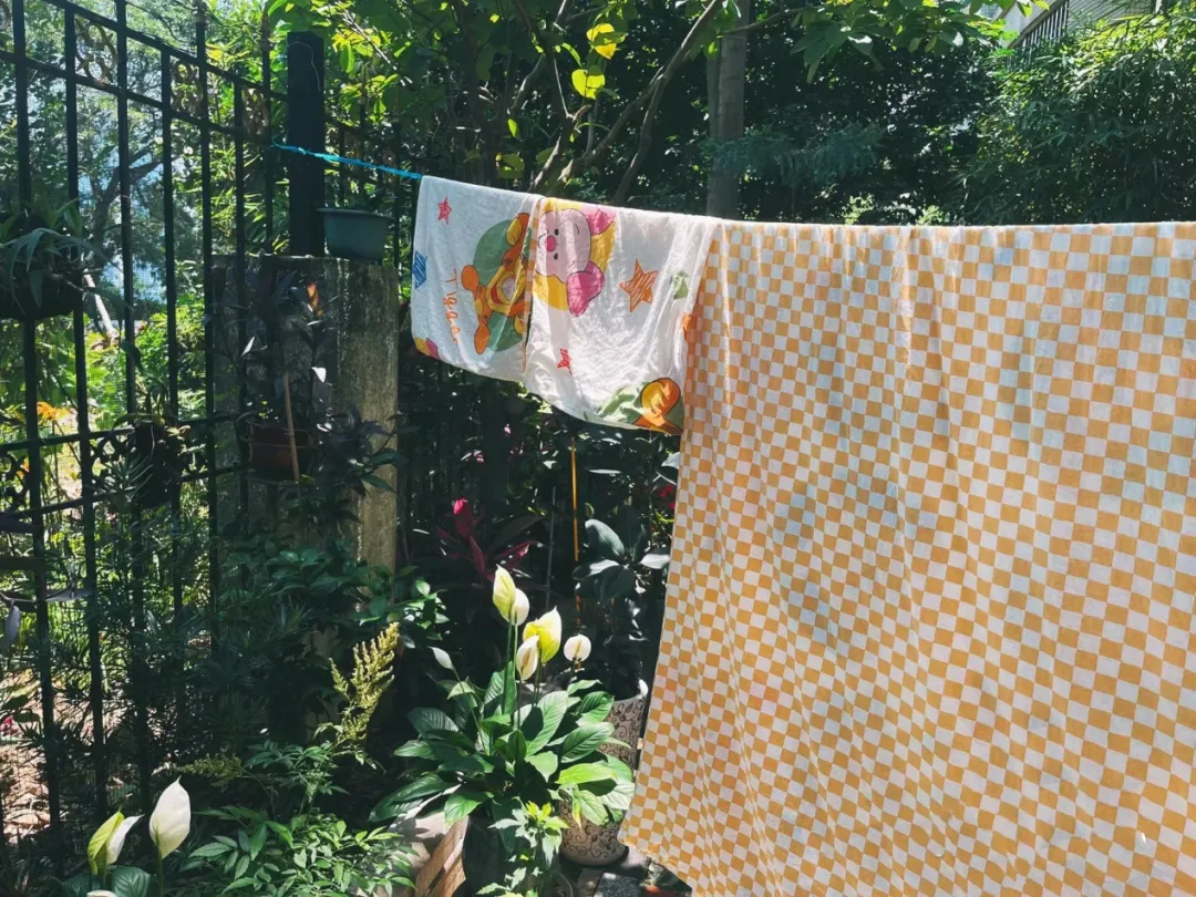 小时候,每一个阳光晴好的日子,家人都会把椅子、竹竿、绳子搬出来,搭出各种高低密密麻麻的晾衣绳,让所有被褥享受日光浴。小孩子会把脸蛋蹭在被子上,呼吸阳光烘烤被子的味道,棉絮被热气笼罩,夹杂着洗衣粉的香气,温暖又舒服。