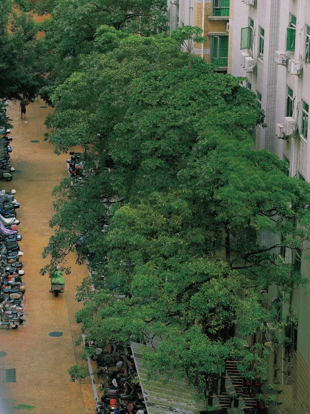 绿树成荫的楼下街道,空气里弥漫着夏天的气息,宁静的午后,行人骑着电动车穿梭于树荫下,那是生活的样子。